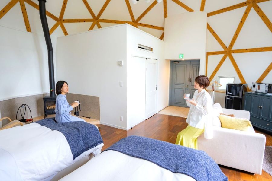 家族旅行で、ワンコと行ってきました、宿周辺は観光する場所が多くて、便利な宿です。 施設とても清潔感があり、ゆったりと過ごせました。 以前宿泊したグランピング施設は、お風呂とトイレが別棟で、いちいち外に出るのが面倒でしたが、こちらは全て宿泊棟の中にあり快適に過ごせました。 ドッグランも隣に設置されていて小型犬には十分すぎる広さです。 また、機会があれば宿泊したいですね。