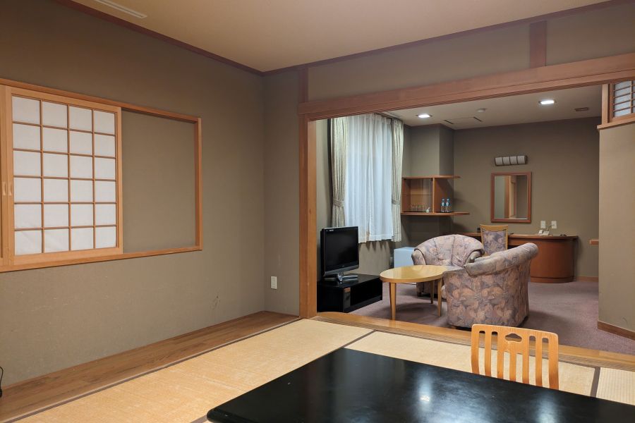 古いホテルで客室は多少古さを感じますが、ラウンジやロビーなどは改装されていて綺麗です。 入り口を入ると暖炉があり薪の火に癒されました。 オールインクルーシブでアルコールを含む飲み物が飲み放題で、ちょっとしたお菓子やおつまみがあり、旅行を楽しめました。 夕食のビッフェも焼きたてのステーキやお寿司が食べられて満足です。 飲み物はセルフサービスですが、値段を考えると文句はありません。 0歳児を連れての旅行でしたが、授乳室があり助かりました。 大浴場にベビーベッドが設置されていると、もっと助かりました。 お風呂は広くはありませんが温まりました。 今回利用はしませんでしたがカラオケやゲームセンター、卓球などあったり、麻雀の貸し出しもあるようです。 ホテル内の売店でちょっとしたお土産が買えます。売店での購入の支払いにはPayPayが使えました。