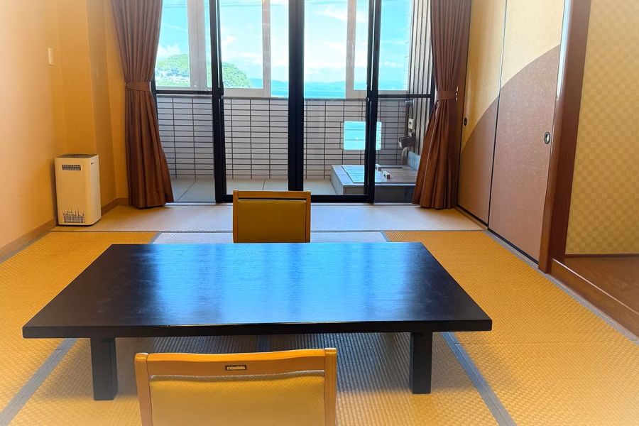 休暇を利用して二人で伺いました。 港から送迎もあるのでアクセスは良いかと思います。 部屋からの眺めはとても良くて、砂浜が一望できるオーシャンビューが素晴らしいです。 また、部屋で食べた料理も海鮮がふんだんに使って調理してありとても美味しかったです。 泊まった部屋にはベランダに部屋付きの露天風呂があり、砂浜を眺めて波の音を聞きながら入れます。 夜は静かな海を眺めて旅を満喫できました。 家族連れや恋人と伺って海水浴を楽しむのも、砂浜が目の前なので有りかと思います。