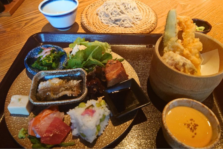 兵庫県三田市で十割蕎麦を提供させていただいてます。国産の蕎麦粉を取り寄せ、ひきたて、うちたて、ゆがきたてのお蕎麦です。おかずのプレートと、天ぷら、お蕎麦とデザートがセットになった「和み膳」がオススメです(数量限定)。