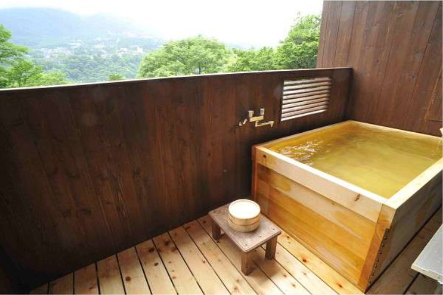 全室バルコニー専用展望露天風呂は、全露天浴槽1mx1.5mの総檜造りになっております。天然温泉「強羅温泉」より源泉100%で加水、加温なしで掛け流しが特徴です。季節感溢れる夕食 全10品以上の料理をお部屋でごゆっくりお召し上がりください。
