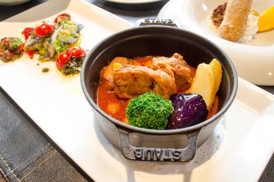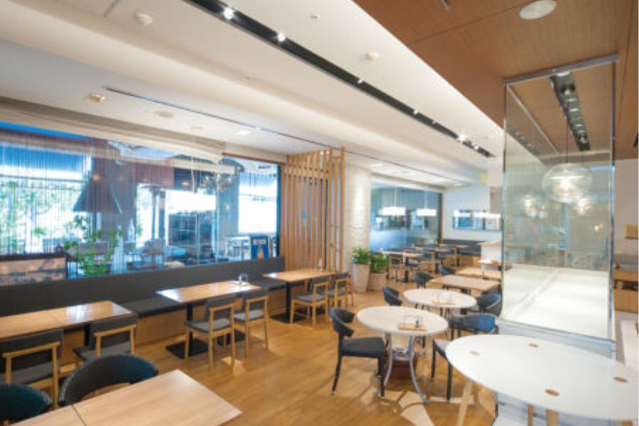 テラス席のある開放的なレストラン。JR東日本 日立駅から徒歩2分のホテル1Fにございます。茨城の銘柄牛「常陸牛」が堪能できる宿泊者限定の「常陸牛ステーキプラン」をはじめ、ローズポークの角煮やつくば鶏を使用したメニューも人気です。朝食では、奥久慈大子町産の米や奥久慈卵なども提供しています。