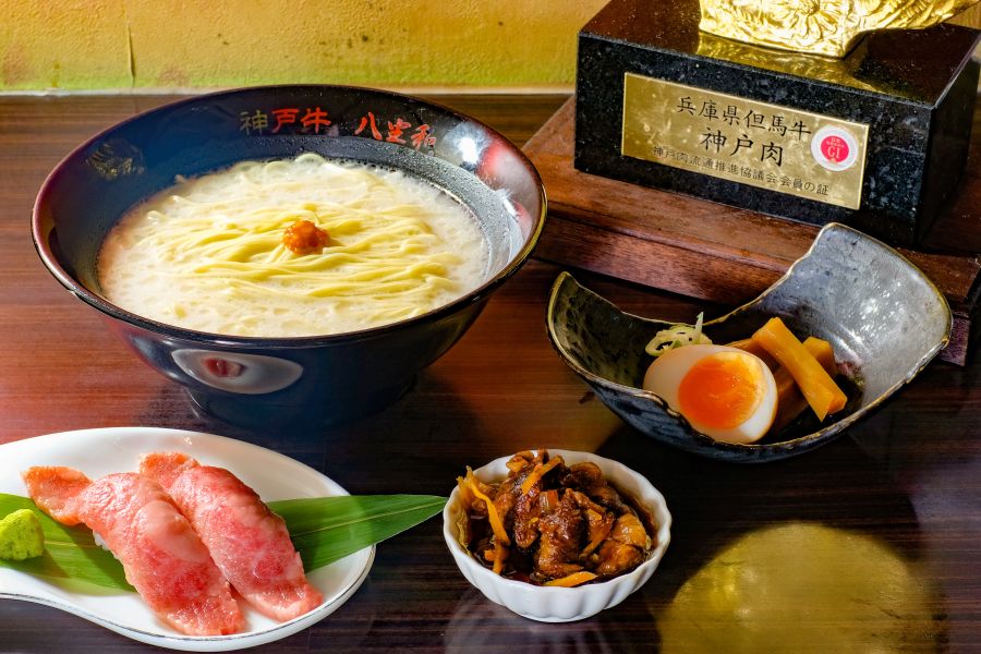 100%牛骨スープが命!肉のプロが創りあげる極上の神戸牛ラーメン。限られた神戸牛専門店しか入手できない神戸牛の牛骨や兵庫県産野菜を使用した他では味わえない神戸牛ラーメンが自慢。豚骨や魚介系のスープには出せない上品かつ濃厚なスープは、最後の一滴まで飲み干したくなる。麺はスープに絡みやすい平打ちの中太麺で、神戸牛チャーシューは口の中でとろける贅沢な味わい。