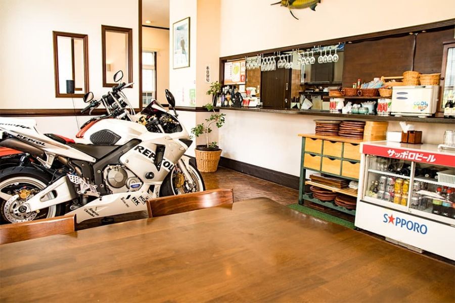 伊豆半島一周ソロツーリングの途中、前回のツーリングで中華料理屋に寄った処にと思っていましたが、好物の洋食屋を探し当てて訪問…。 店先には他県ナンバーバイクが6〜7台、バイカーお気に入りの店のようです。 店内はアラジンのストーブや年季の入った調度品が並びます。 そして驚いたことに私の愛車と同じバイクが綺麗に磨かれ鎮座! 先に案内され早々にメニューを見ると「ライダーズバーグ」。 陳腐な紙ナプキンではなく、熱々のおしぼりが嬉しい! バイカーが多いのに合点! 今回オーダーしたのは「ライダーズバーグ3号」、熱々のハンバーグは程良く柔らかく老若男女が好む優しい味付けの印象。 ハンバーグの下には焦げ付かない為だろうインゲンが敷き詰められています。 キノコと玉葱も添えてあり、甘味が引き立ちます。 食後のコーヒーカップ、これも平成令和ではお目にかからない物。 ナイフフォークも同様、使い込まれた経年変化が店の歴史を感じました。 メニューは豊富、次回は別の品を食べてみたいと感じる店です。