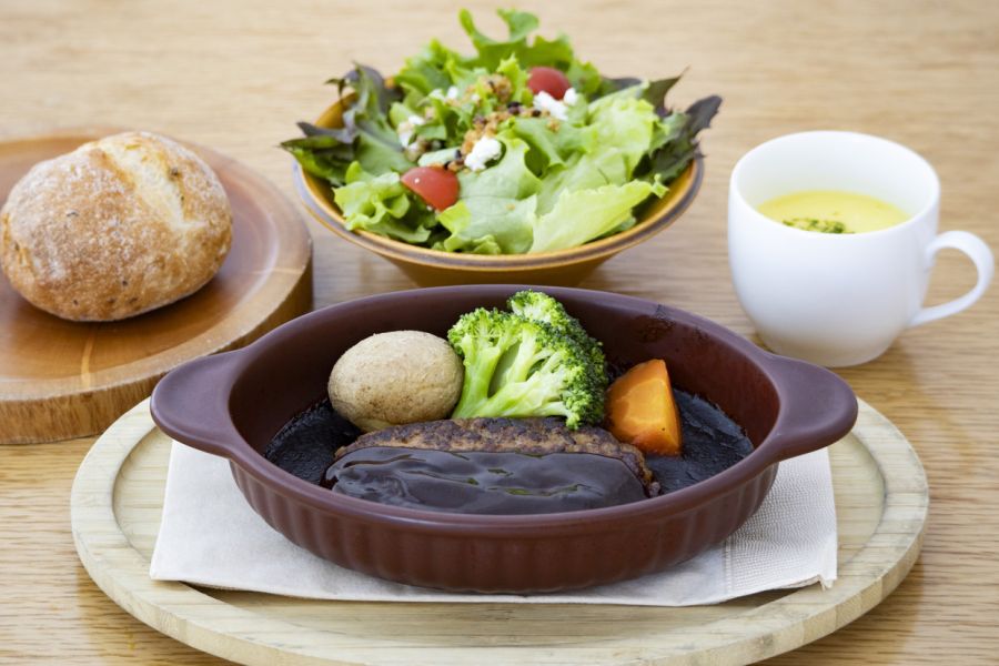 自家製ハンバーグチーズフォンデュソースを注文。 目の前で、ハンバーグにチーズソースをたっぷりかけて仕上げてくださいます。 ハンバーグは柔らかくジューシーでしたが、少ししょっぱいように感じました。 パンにサラダ、デザートはどれも美味しかったです! フロアは広く清潔感があり、ゆっくり食事のできる雰囲気の良いカフェ。 なにより店員さんの感じがとても良かったです!