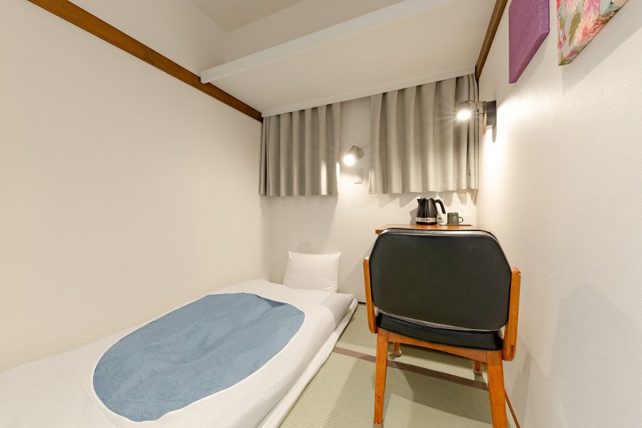 立地は最高です。 部屋は狭く、ベッドではなく小上がりの畳に布団が敷かれている。 布団も寸足らずで少し短い気がする。 シャワーは水圧がめちゃくちゃ弱い。