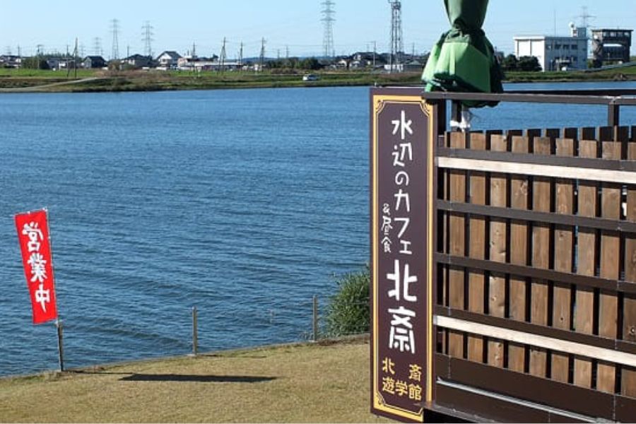 当館では、食の要である米を貯めていた蔵を引き継ぎ、地場の野菜を売り、それを使う食事処として利用しています。特に自家栽培のお米は県外のファンも多く、「美味しい」と大好評です。北斎の描いた富嶽三十六景、常州牛堀の景色、湖上の夕日と筑波山を眺めながらゆったりとお過ごしください。
