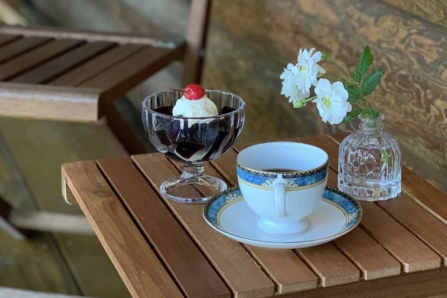 自家焙煎の珈琲を豆から選べる珈琲や、珈琲ゼリー、アフォカード、ナポリタンなどがあります。雰囲気のいい、森の中の珈琲店です