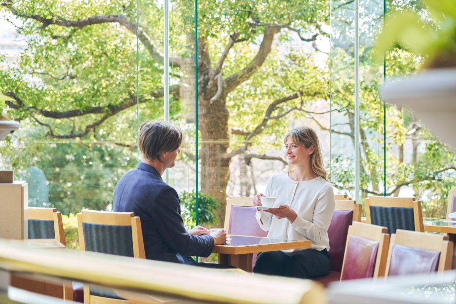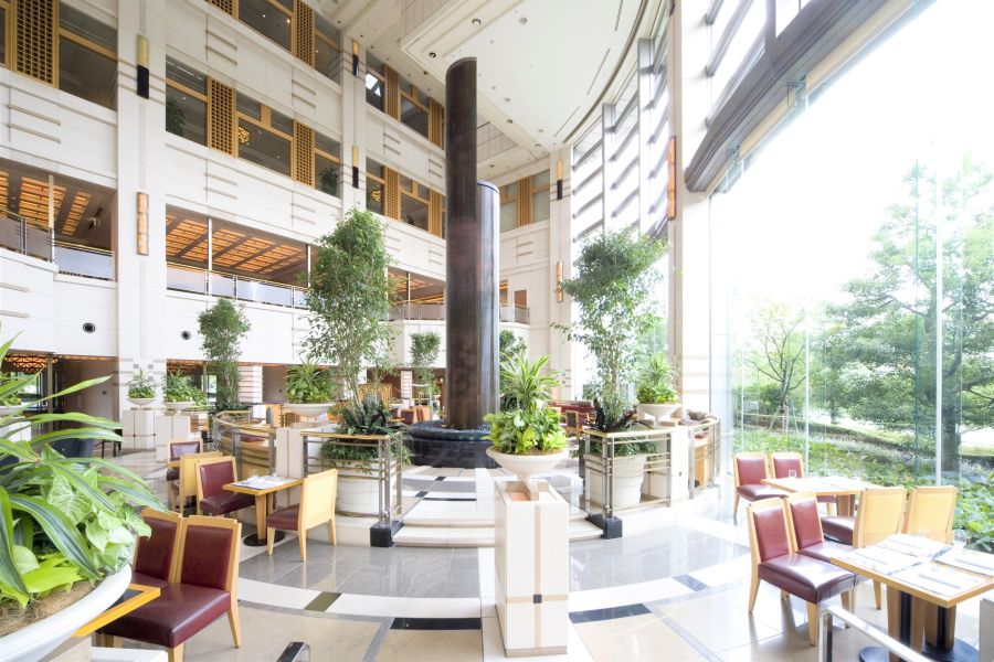 帝国ホテル 大阪のテーマ「水、緑、花そして光と影」を表現した24mの吹き抜けのアトリウムに、水のオブジェに窓からの陽光と隣接する遊歩道の風景が明るく開放感あふれるロビーラウンジです。お待ち合わせや、ご商談、お買い物のひとときに、バラエティ豊かなデザートやドリンク、季節によってメニューが変わるアフタヌーンティーやバイキングをご用意しています。