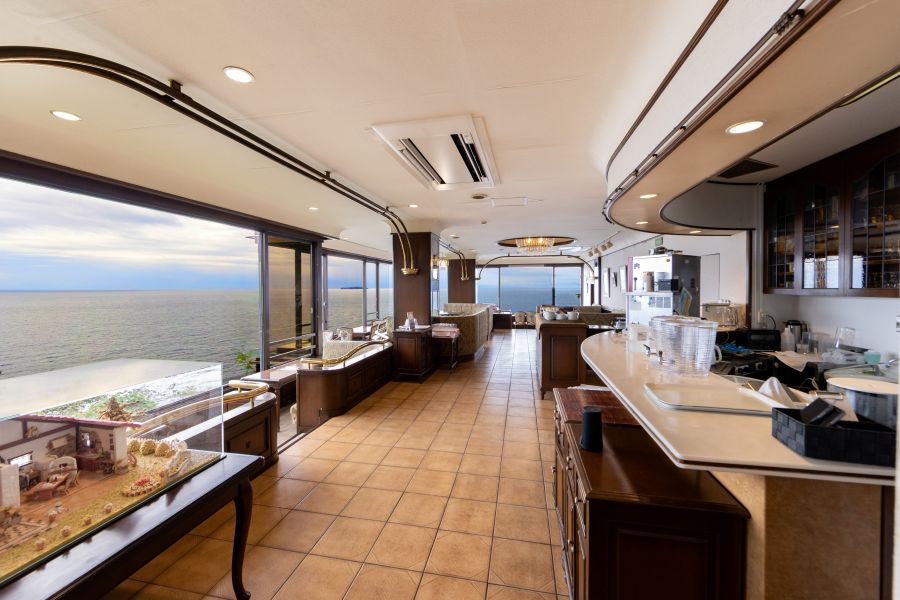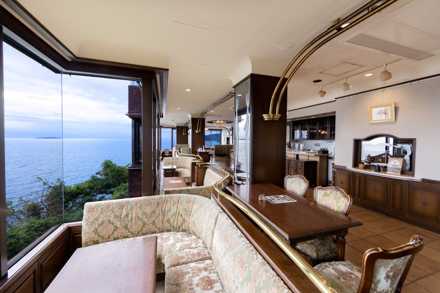 目の前に広がる海を楽しみながら、素敵なひと時が過ごせるカフェ。あいにくの曇りではあったものの充分楽しめました。 こうした景観を楽しみたい方は事前予約することをおすすめします。 【店舗概要】 ホテル『ニューアカオ』さんにあるオーシャンビュー付カフェ。 広大な相模灘と錦ヶ浦の断崖を窓越しに臨む伊豆有数の絶景カフェ。 ヨーロッパ風に仕上がった内装も魅力の一つ。 【お品書き】 ・プリンア・ラ・モード(ドリンクセット) 2,250円(税込) 昔ぽいムチンとした固めプリン。ほんのり感じる卵の風味。バニラビーンズの粒は見えるが風味はしない。 プリンの下にはパンナコッタ、静岡産イチゴを使用したジャムやパイ生地などがあり、最後まで様々な食感を楽しめる。 柿や巨峰など旬の果物を中心に盛り付けてある。 正直値段には見合わないプリンア・ラ・モードであると思う。しかしこのカフェは景色メインだと思うため、特にクオリティは気にならない。 -------------------------------------------- 【訪問日時】 2024年11月13時30分 【場所】 熱海駅より車で10分/錦ヶ浦(バス)より徒歩3分 【予約】 ネット予約あり 【訪問時点の評価】 4.1点 【おすすめ利用場面】 デート・家族・知人