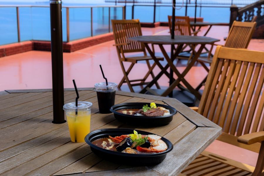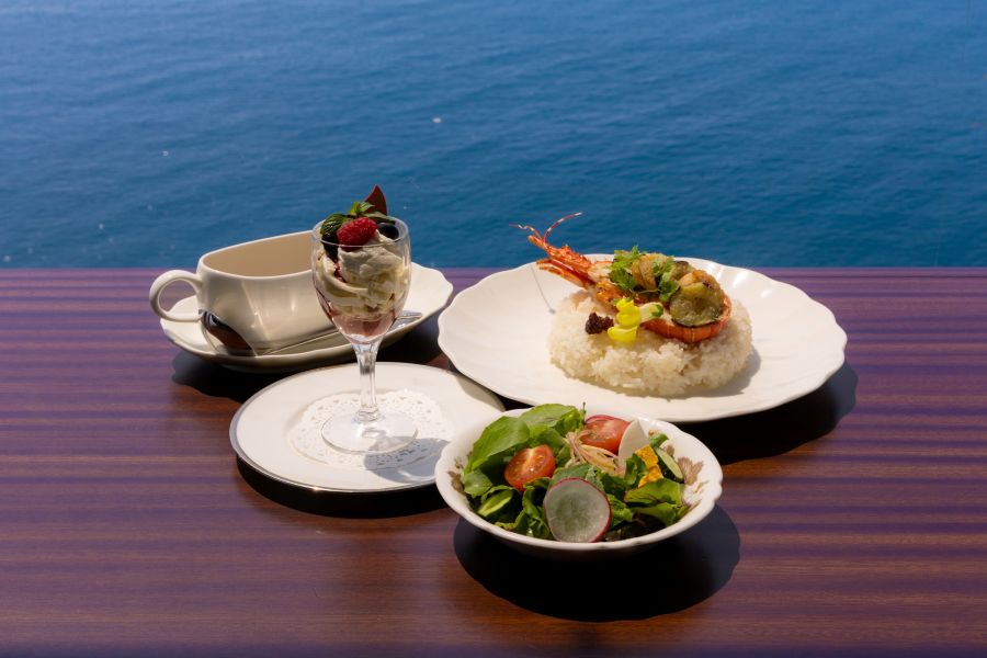 綺麗な海を眺めながら、シーフードカレーやスイーツをいただきました。 断崖絶壁にあるお店なので、大きな窓からの眺めは最高でした。