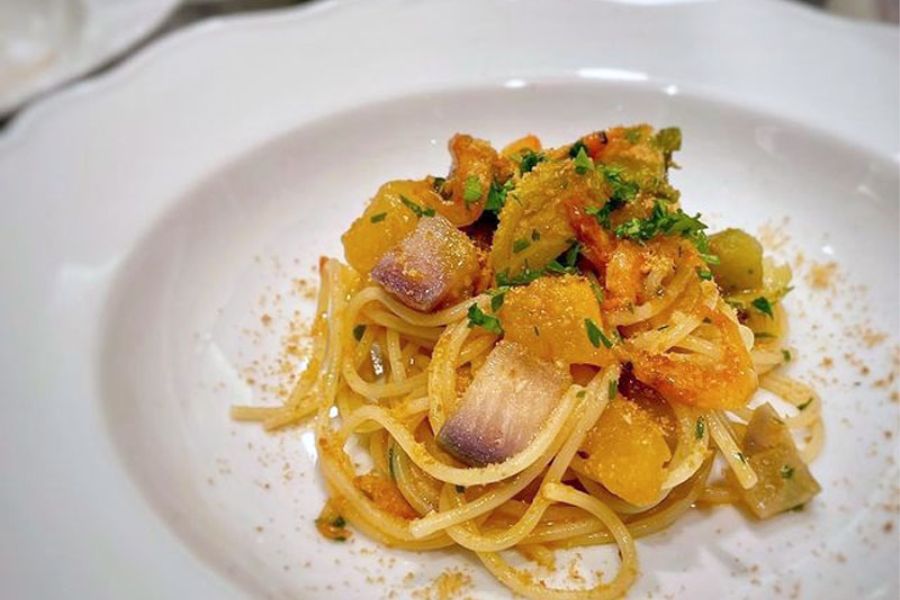 ランチのAコースをいただきました。 前菜盛り合わせ、スープ、パスタ2種、デザートという構成。 前菜盛り合わせは、オクラのフリットが美味しかった! スープはとうもろこしの冷製スープ。 この時期のとうもろこしは美味しいですね! パスタは、カラスミとキノコのパスタと、リングイネ。 どちらも美味しかったです。
