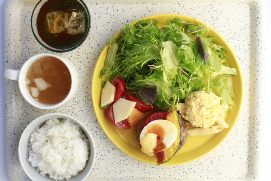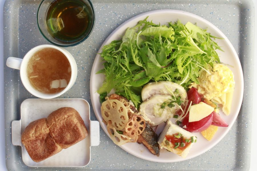 大きいオブジェで有名な春華堂さん内にあるお店です。 日曜日の12時30分頃にお邪魔しましたが、8組待ちの人気のお店です。 選べるワンプレートの前菜4種をいただきました。 ヘルシーで美味しかったです。 コーヒー等はフリードリンクとなっています。