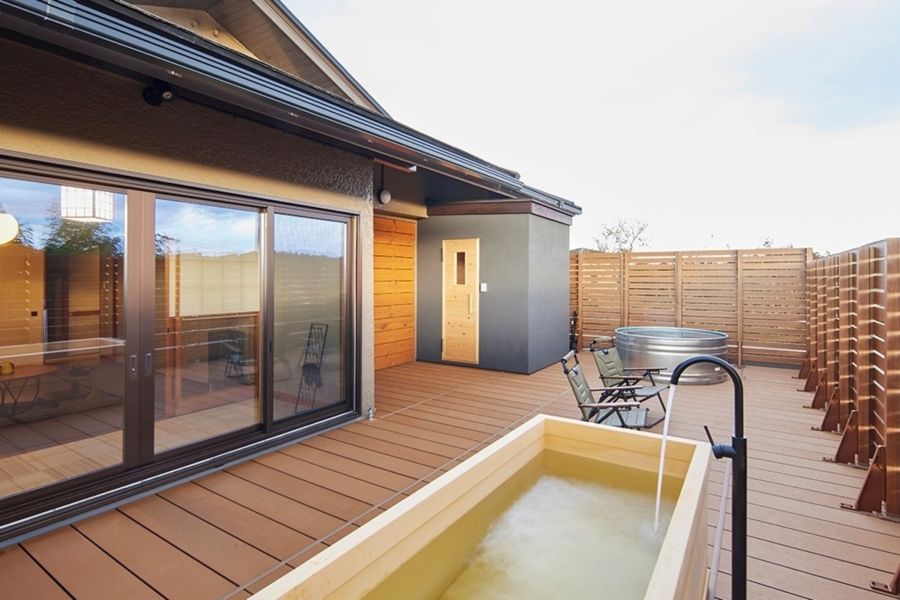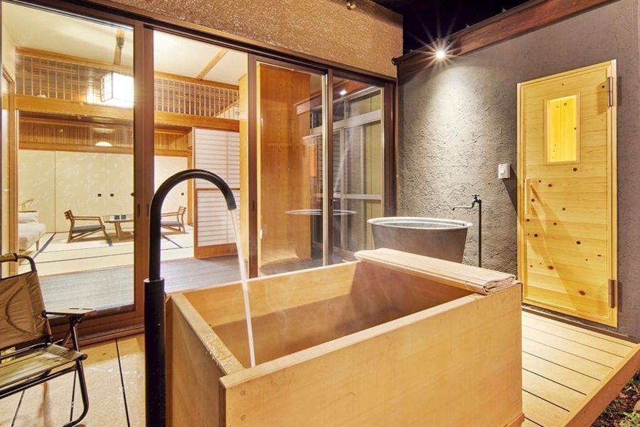 伊東の高台に佇む、600坪の庭を誇る和の邸宅をフルリノベーション。風情ある趣の石の庭を感じる1階を「マイグレ600 石庭」、広いデッキから天城の山々や一碧湖を望める2階を「マイグレ600 天上」として、1日2組ご宿泊いただけます。どちらも高級旅館のような和の客室に本格的なプライベートサウナ、天然温泉の露天風呂、水風呂を設えております。総檜のサウナ室には、超高熱度のharviaサウナストーブを採用。シャワーで汗を流した後は地下から汲み上げられた冷たい天然水で冷水浴を、檜の露天風呂では天然温泉をお楽しみいただけます。趣のある石庭を眺めながら、極上の「ととのい」をご堪能ください!