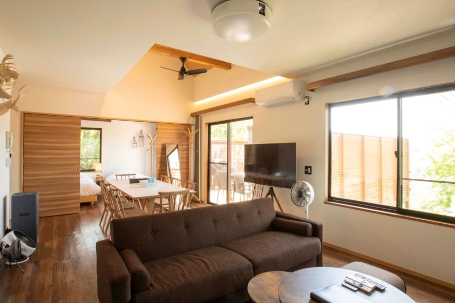 女子会で利用させていただきました。テラスから見える景色は絶景!紅葉が綺麗で夕暮れ時と早朝の眺めに癒されました🍁室内はとても綺麗で、家具・家電も充実。床暖もあり、冷え性な私には有難すぎました。笑 露天風呂もサウナも最高。大人だけでなく子どもたちも大喜びでみんな大満足。小さいお子様がいらっしゃる方は周りを気にせず、ゆっくり過ごせるのでほんっとうにおすすめです。帰る時には年1回は来たいね〜とみんなで話していました。次は他のお部屋も利用してみたいです。ありがとうございました。