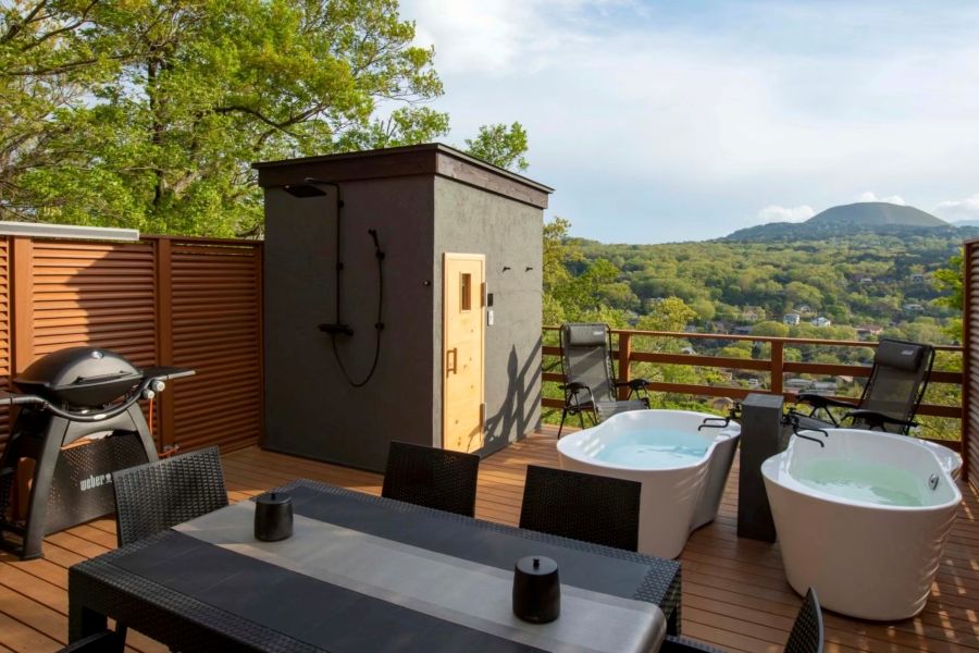 四季折々の雄大な美景に癒される大人の隠れ家のような一棟貸別荘 マイグレIKKI。眼下には一碧湖、正面には大室山をのぞむ天然木のウッドデッキテラス。本格的なプライベートサウナと、サウナ小屋横には漆黒のオーバーヘッドシャワーにスタイリッシュなバスタブ。地下から汲み上げられた冷たい天然水で冷水浴を。極上の「ととのい」をお楽しみください!