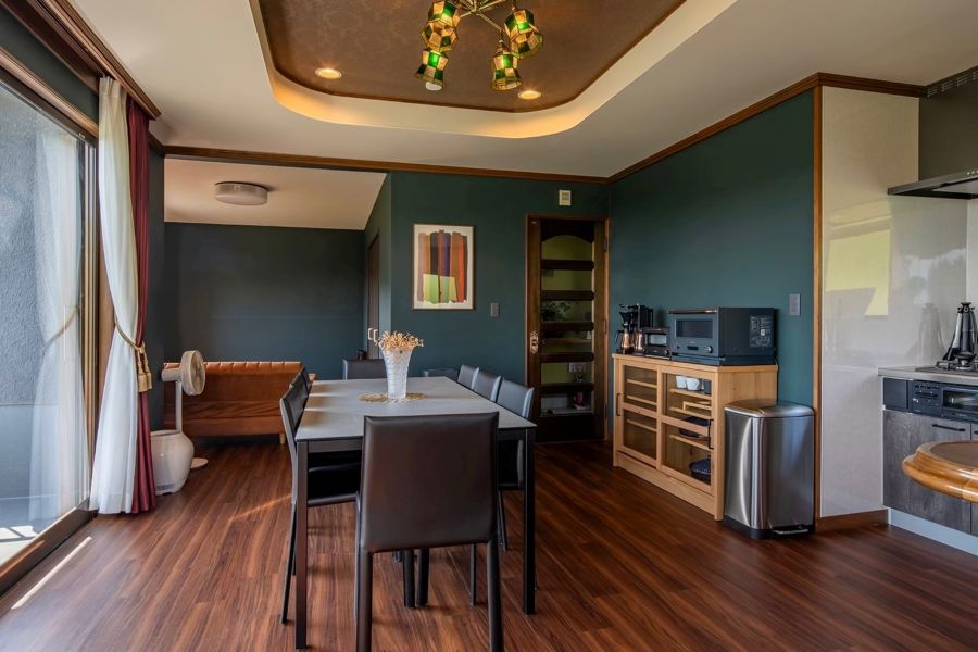 伊東の森、空、海を見渡す緑に囲まれた高台に佇む温泉付き一棟貸別荘 マイグレYEBISUのコンセプトは「大正浪漫」。和の安らぎと洋の華やかさを掛け合わせた、モダンで色彩豊かな空間です。細部までこだわったノスタルジックな意匠は、目を楽しませるだけでなく大人の隠れ家にふさわしい落ち着きも演出。また当施設では、フィンランドサウナとミストサウナの2種類をご用意。天然水冷水浴、天然温泉露天風呂をご堪能いただけます。サウナや温泉で整ったあとは、上品でレトロな空間に身を委ねゆったりと流れる時間をお愉しみください!