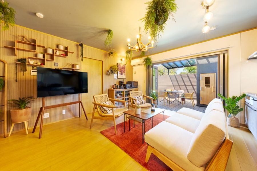 マイグレA5は、北欧デザインと豊かな緑をコンセプトに、自然素材の温もりと緑あふれる空間が調和した新しいスタイルの一棟貸別荘です。内装には北欧デザインを採用し、温かみがありつつも洗練された雰囲気を醸成。天井から優雅に垂れ下がる植物が非日常の世界を彩り、まるで森の中の北欧カフェにいるような癒しの空間を演出しています。また、自慢のサウナ小屋も完備しています。マイグレお馴染みの本格的なフィンランド製サウナヒーターHarviaを採用しているほか、2段式のベンチ構造となっているので、自分に合った温度で楽しむことができます。大自然を目の前にした露天風呂で、思う存分リフレッシュしてください!