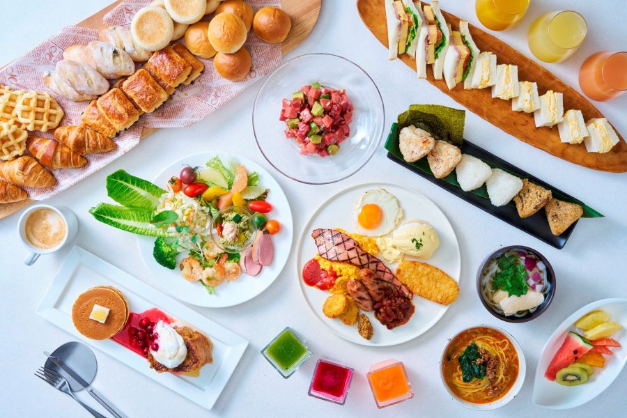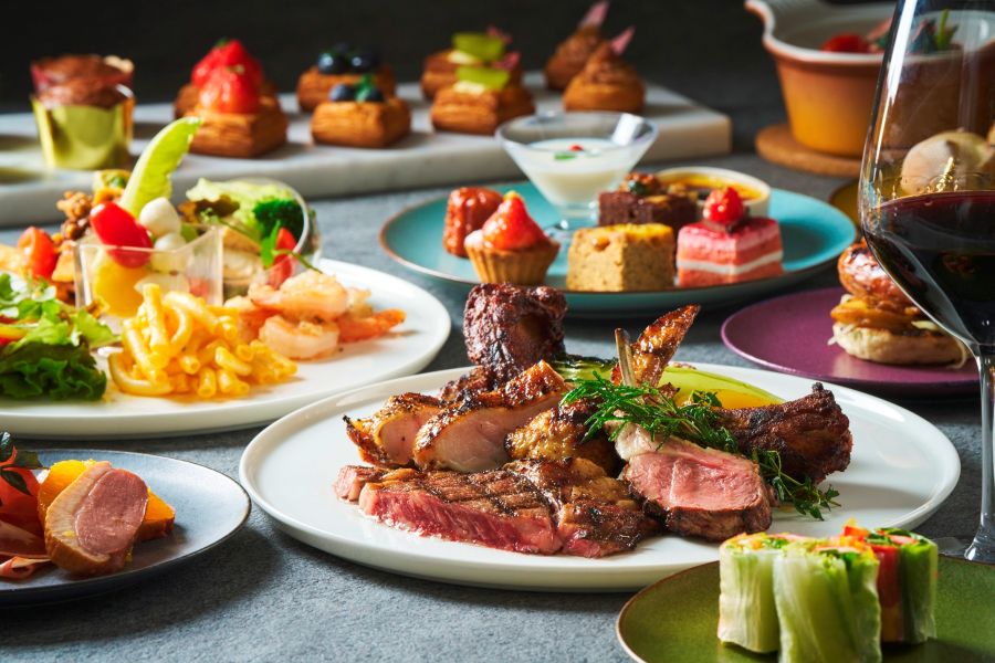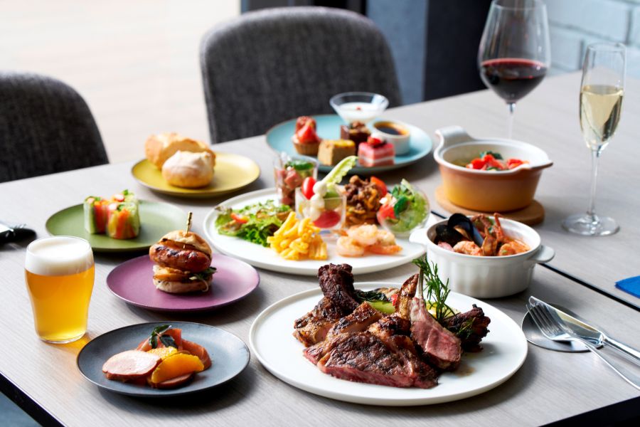 ランチでは、国産牛リブロース、キビまる豚スペアリブ、島豚ソーセージ、仔羊、スパイシーチキンなどをチャコールグリル(炭火焼き)で焼き上げ、シェフ自らテーブルをワゴンでまわりながらご提供。ナチョスサラダ・生ハムと柑橘系のサラダ・ポキサラダ・カプレーゼ・よだれ鶏などのシリンダーオードブルほか、焼き菓子やムースなど季節のデザートもビュッフェスタイルで好きなだけ楽しめる。平日はタコス、土・日・祝日は肉がグレードアップするほか、スパークリングワインもフリーフロー(飲み放題)に。朝食やバータイムのメニューも豊富で、オリオンビール工場直送の特別醸造ビールを楽しめるオールデイダイニング。