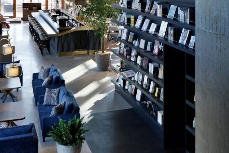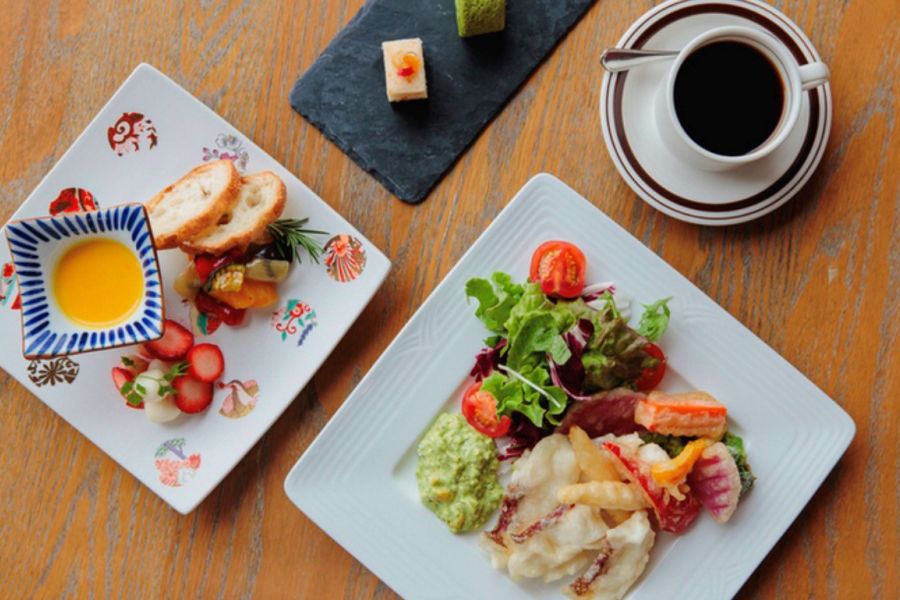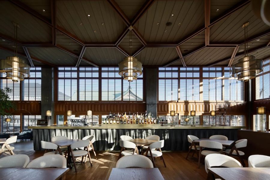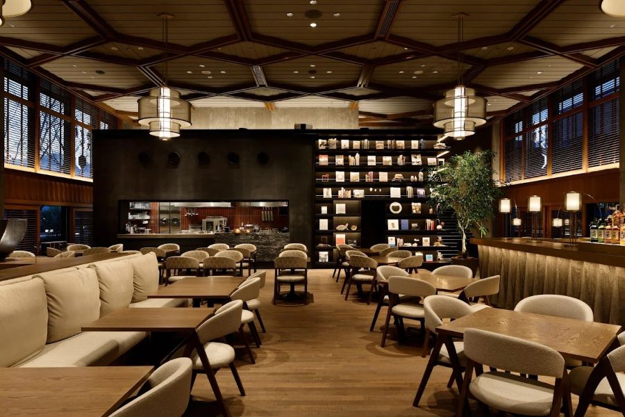 日本を代表するモダニズム建築「ロームシアター京都」の2階に位置する、開放感あふれるカフェ&レストランです。「京都の四季を五感で楽しむ」をコンセプトに、旬の素材を活かした和洋折衷のメニューを提供しています。天井高約6メートルの広々とした店内には、テラス席も完備(テラス席のみペット同伴可)。ランチ、ティータイム、ディナーまで、刻々と表情を変える岡崎の風景とともに、ゆったりとした時間をお過ごしいただけます。店内の本を片手に、文化的なひとときを愉しむのにも最適な空間です。