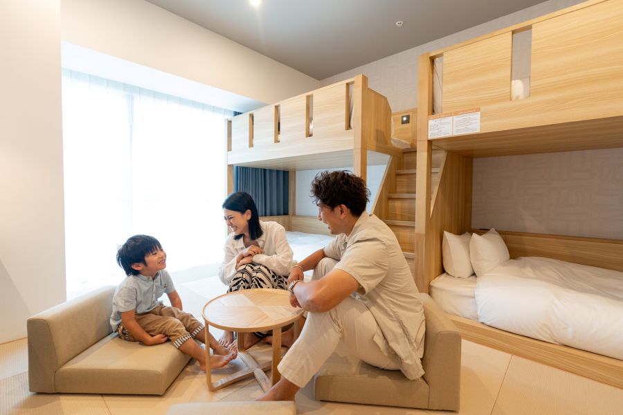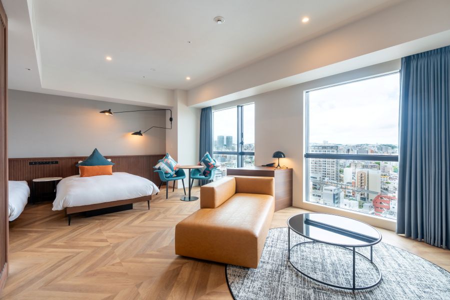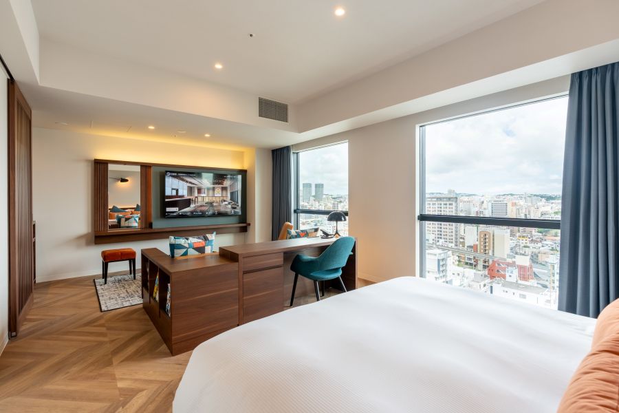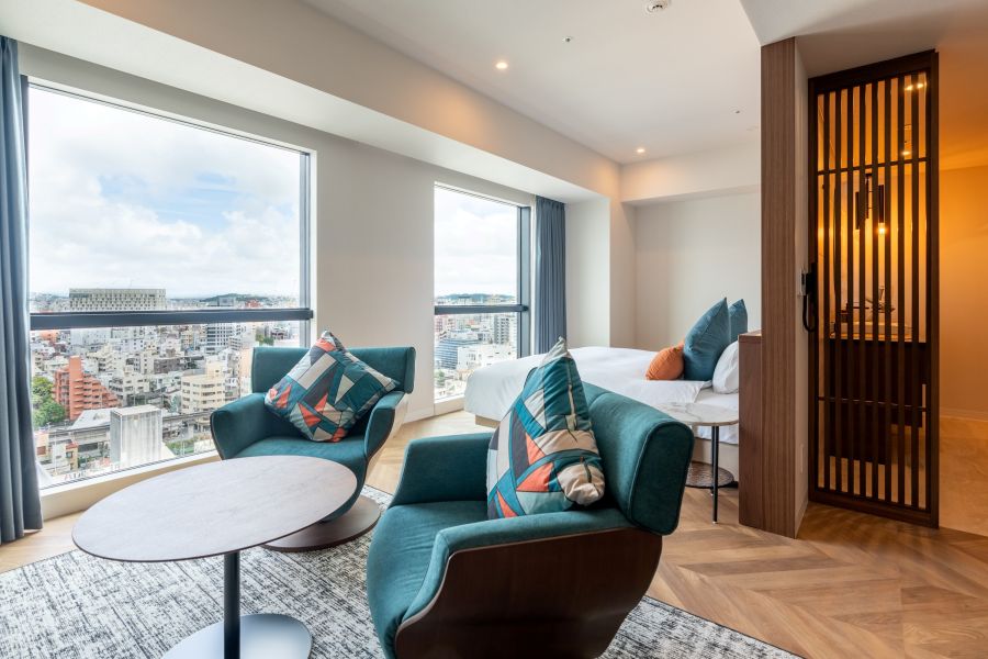 沖縄旅行の際に夫婦にて初めて利用しました。 2025年にオープンしたホテルらしくとても綺麗でお洒落なホテル。 旅行の目的が泊港からフェリーに乗って離島に渡る事がメインだったのでこのホテルを選んだのですが泊港まで徒歩10分位でゆいレール美栄橋駅まで10分位、国際通りまでも徒歩15分位なのでとても便利な場所です。国際通りまでタクシーを使ってもワンメーター位(600円)で行けます。 ホテルの造りが少し変わっている?感じでフロント(ロビー)が最上階の17階にあってエレベーターで上がって行くのですが1階の入り口から入ると場所を間違えた感じがするので(ホテルらしさがなくオフィスビルの様な感じでエレベーターホールで一度引き返していたお客さんがいました)注意?が必要かも。 高層階にロビーがあるのでロビーからの景色は最高で市内を一望できます。 スタッフの方も親切丁寧でテキパキとした対応でとても良かったです。 宿泊した部屋は5階だったので景色という風景はなく隣のビルが見える感じでもし景色を楽しみたいなら10階以上のお部屋がオススメかもです。 お部屋はとても綺麗で広さも丁度よくトイレとバスも別々で使い勝手は良かったです。 アメニティはロビーのある階にあってチェックインした時に必要な分を持ってくるスタイルなんですが1つ気になった事があってお風呂に洗面器が無いのとティッシュがお部屋にしかなく洗面所には無いのでメイクや身支度の際に使いすぎると足りなくなりそうな感じがしました。(花粉症や鼻炎持ちの方は注意が必要です) 朝ご飯はバイキングスタイルで沖縄らしさのある料理が並んでいて旅の始まりを彩ってくれます。レストランは1階にあって国道沿いに面していますがお洒落なカフェのような感じで清潔感もありとても良いです。 あとチェックアウトも条件はあるのかもしれませんが部屋のテレビ画面でチェックアウトの手続きができて17階のロビーに行く事なく帰る事ができるのがとても便利でした。 素晴らしいホテルに泊まることができて良いスタッフの方々に出会え楽しい旅行にできたことに感謝です。 次回沖縄に来ることができたならまた利用したいと思います。