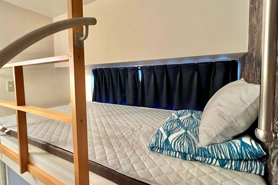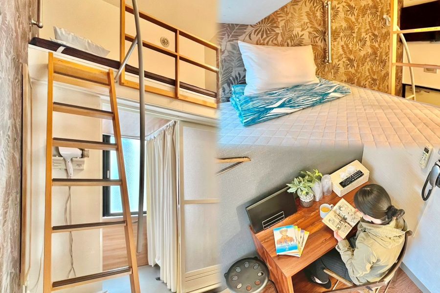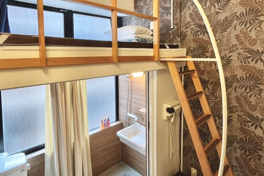 3泊しました 高評価の人も多いが私には合わなかったかな。 人を選ぶ宿です。 梯子が華奢で怖い。角度はどうにもならないと思うが踏み板をもっと大きくすることは出来そう。 上り下りがしづらい上にテレビは上で見ることになる。リモコンを持って上がるのも怖い。そして上には物を置くところがないのでスマホや眼鏡を置く場所が欲しい。 持って梯子を上らなくてもいいように上からも下からも届く網棚でもあれば。 天井の梁が大きいのでぶつかると痛い。角にクッションでもつけてほしい。 トイレとシャワールームは無駄に大きい。これなら間に壁を付けることもできるだろう。トイレ側に水もいかないし暖房洗浄便座も付けられる。シャワールーム側の扉に取っ手がないので開けるのが不便。 ドリンクバーは部屋のコップを使わないといけないので帰ってきてすぐに飲むことは出来ない。コップを取りに行く手間がある。 うどんはよかったけど沖縄そばにならないかなぁ。 滞在中の掃除は不要と言っておいたが掃除された。