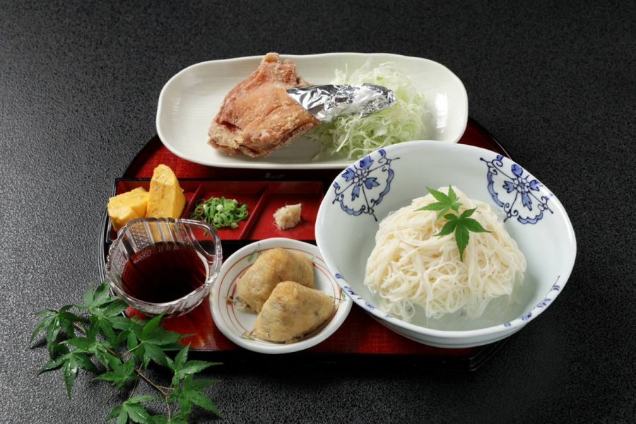 初訪店 「ソーメンセット」と「ぶつ」の単品を注文しました☝🏻 ソーメンセットの唐揚げは、もも・ぶつ・ぬきから選べるようで、イナリのご飯はとり飯?😍 唐揚げも美味しかったですが、やはり島原といえばソーメン❗️しっかり美味しくいただけました😋 口コミで「待ち時間や料理提供までの時間が長い」とありましたが、私たちはすぐに席に案内され、料理の提供も早かったです。観光シーズンや大型連休などは混雑するのかもしれませんね🤔 私どもは大広間のような所に案内されましたが、靴を脱ぐ必要があり、前のお客さんの食べこぼし等が床に残ったままだったのが少し気になりました😖
