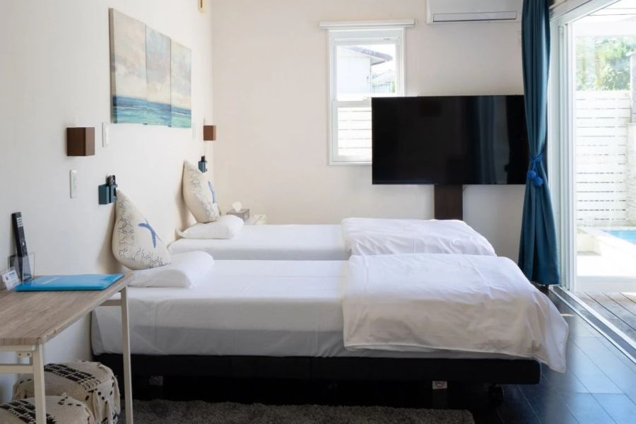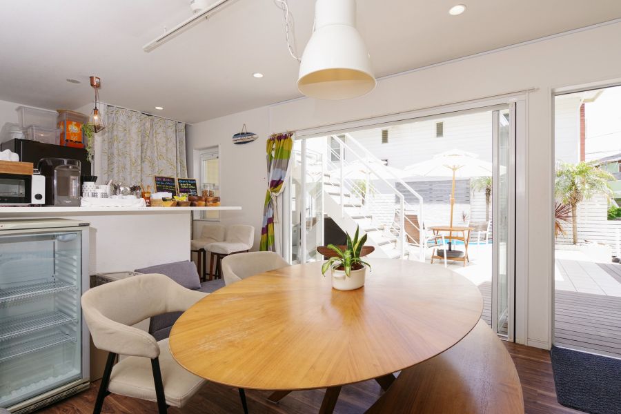 海近いです! ゲストハウスとなってますが、お部屋はホテル並みに綺麗。使い勝手も良いです。 庭のプールはこじんまりな雰囲気程度ですが、 リゾート感がでてます。 近くにクリエイトがあるので、買い物にも便利。 天井がやや薄めなのか、お子様連れの方が泊まられると、一階の部屋だてやや響くのが、唯一気になりました。