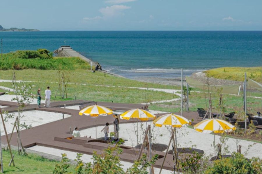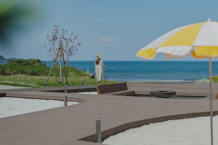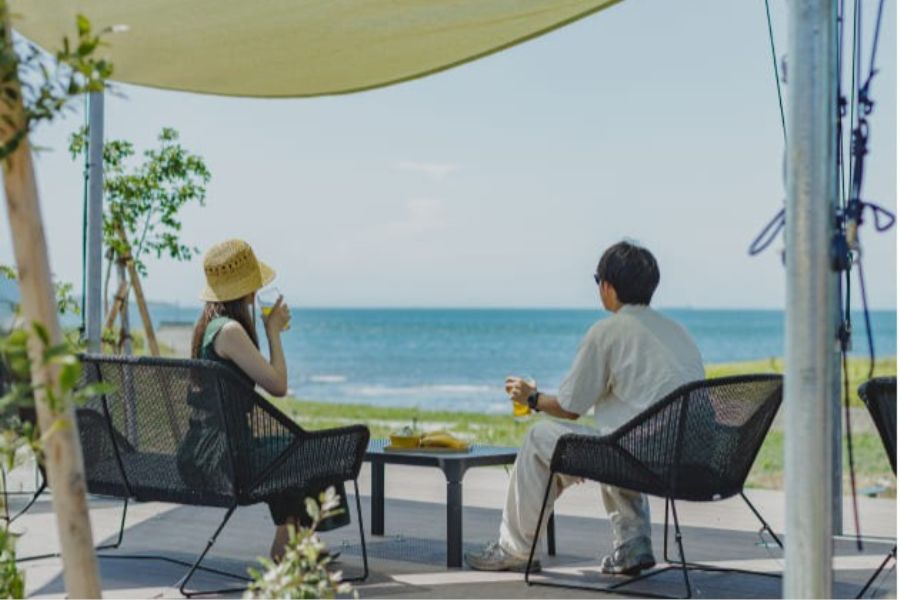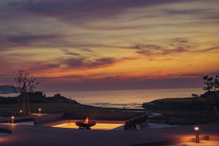 館山の夕日を、大きなテラスから眺めて。ただ、たゆたうための海辺のホテル。せわしない日常から、ゆるりと南房総・館山へ。夕暮れ時に訪れたら、ビールを片手に、思い思いの旅と休息を。ここは、あなたのための等身大リゾートです。海へと続く約2,700㎡の公園のようなテラスには、ウッドデッキやファイヤーピットを配置。気持ちの良い朝はコーヒーを、昼間は家族や愛犬と共に散策、夜はお好みのドリンクと焚き火でリラックスした時間を。フリードリンク&スナックもご用意し、皆様のお越しをお待ちしております。