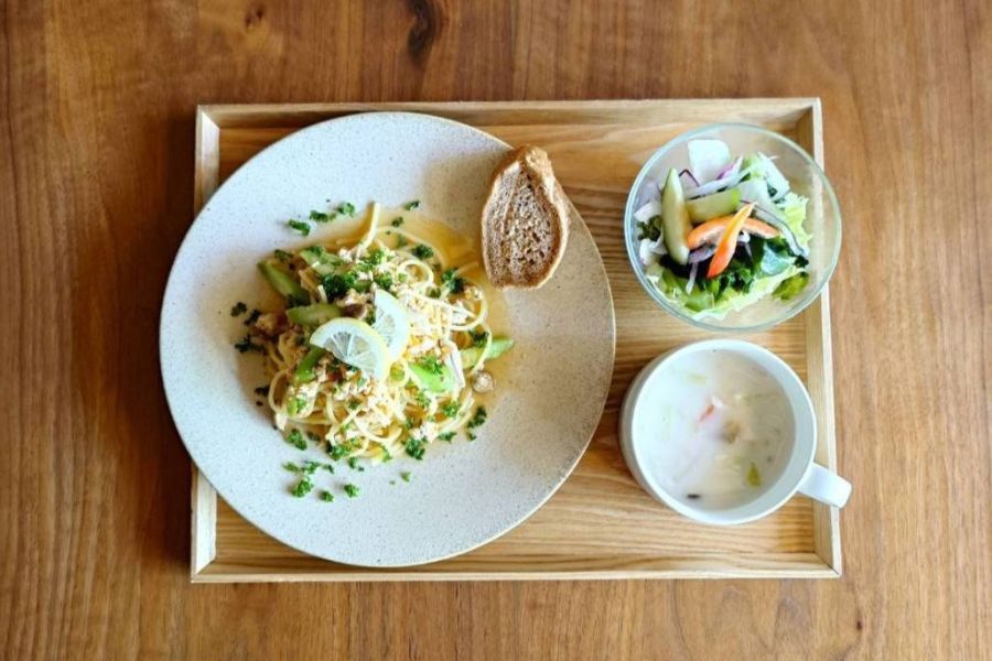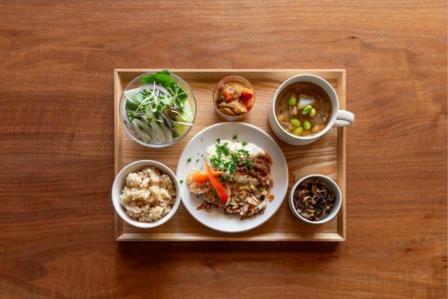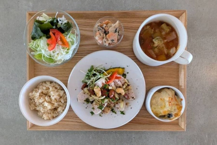 自社農場で育てた、栽培期間中農薬不使用のお野菜などをとりいれながら体にやさしいお料理を提供しています。【昼の部】は週替わりプレートを中心に、パスタ、唐揚げなど数種類のプレートを展開。金曜日、土曜日は【夜の部】営業をしており【夜の部】限定メニューのアラカルト、ステーキ、お酒などを提供しています。スイーツはグラニュー糖、上白糖などは使用せず、腸内環境を整える「てんさい糖」、ミネラルが豊富な「きび砂糖」、カロリー&糖質ゼロの自然派甘味料、黒糖など身体に優しい調味料を使用しています。季節限定スイーツをはじめ定番のおからチョコラート、3種ナッツのキャラメルタルトなど数種類スイーツを展開。