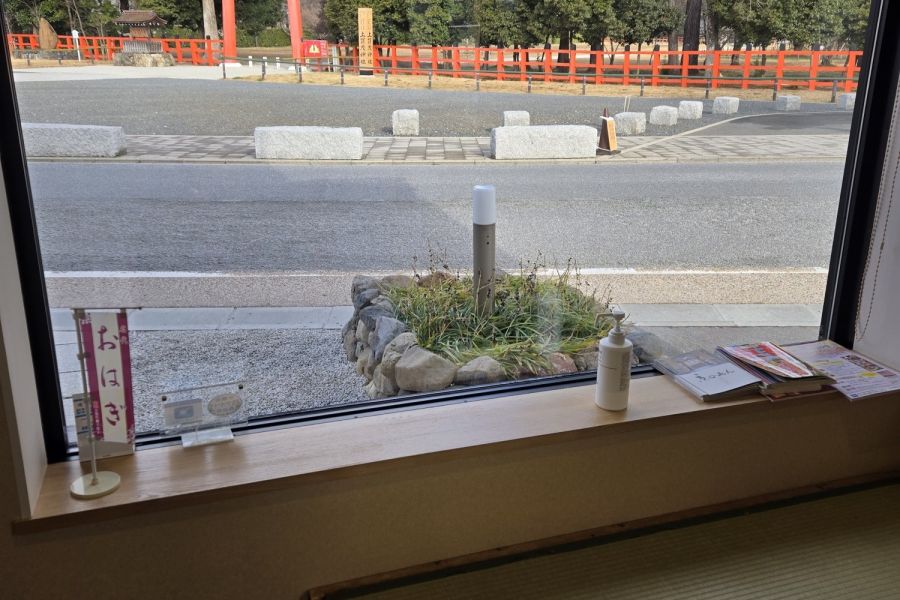 上賀茂神社、大鳥居の真ん前(ちょっと横)にあるやきもち屋さんです。やきもち屋と書くと、性格の話をしているみたいですが、そうではないです。焼いたお餅の事です。 持ち帰り用の和菓子屋然とした店舗もありますが、お隣にオシャレなカフェがありました。葵家さんのカフェかと思ったら違いましたが、やきもちの持ち込みはOKなのだそうです。共存共栄。素晴らしい。まあ僕らは葵家さんでやきもち(と、妻は季節限定いもおはぎ)を購入し、外で食べさせてもらいました。 良いですね、優しい甘さで美味しかったです。お店の女性店員さんは焼いているところも見せて下さいました。男性の店員さんの方はちょいと怖かったです笑