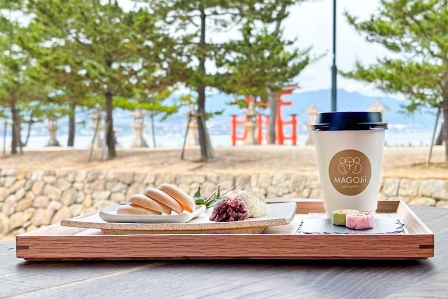 宮島にある「MAGOJii café&gallery」は、大鳥居を見渡せる絶景が魅力のカフェです。抹茶ラテやほうじ茶ラテ、挽きたてのコーヒーなどこだわりのドリンクが人気。自家製餡を使ったスウィーツも楽しめ、ランチメニューもご用意しています。ゆったりとした時間が流れる店内で、宮島の景色とともにくつろぎのひとときをお過ごしください。2階にはギャラリースペースがあり、作家さんが生み出す素敵なアート作品を展示・販売しています。カフェとアートを同時に楽しめる特別な空間です。