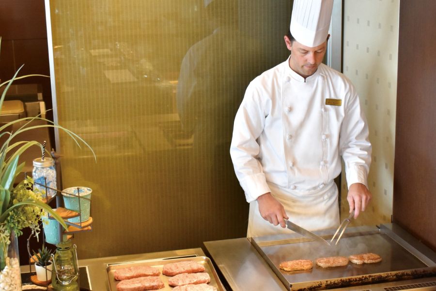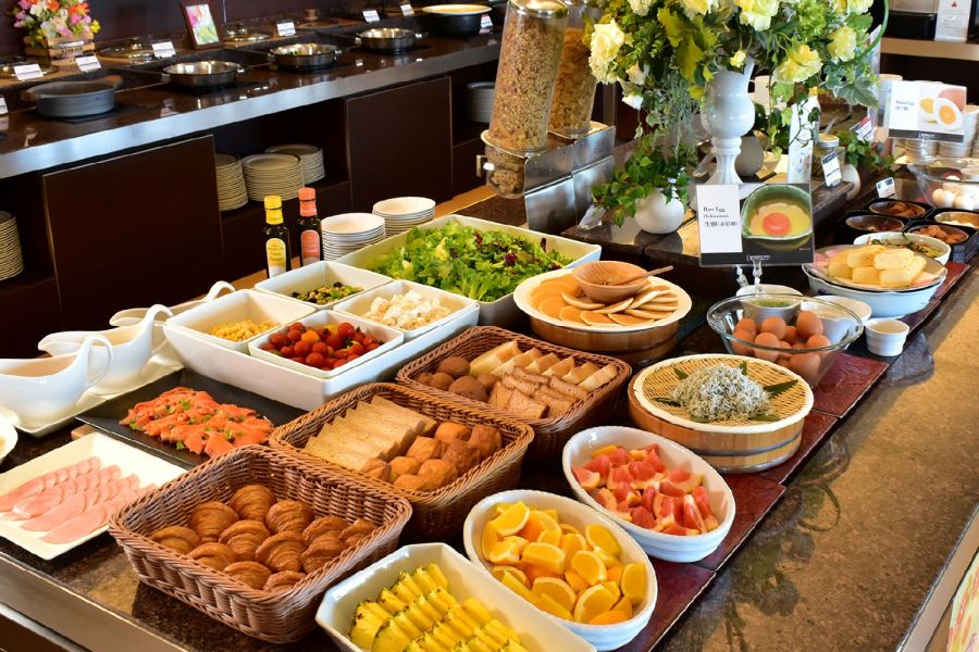 すごい眺望! 窓議席で大満足。 朝食バイキング3800円だが、宿泊客は20%off シェフによるオムレツがあり、シュウマイは柔らかくて美味しい。たこ焼きも関西を演出していて、これぞホテルのバイキング!