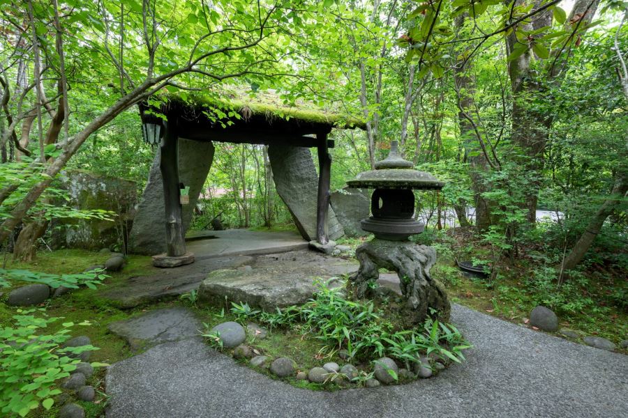 旅館の庭が広いというよりも「森の中に佇む旅館」と言うのがぴったりで大きな石や岩に溢れる程の緑の連続。森の精になったようで癒されます。 季節は秋。丁度栗が落ちていたり僅かながら紅葉したりと深まりゆく季節を感じられました。 今日の目的は立ち寄り湯で貸切風呂にしました。もう五種類全て入湯済みの中から「釜湯」を選びました。良質の温泉にバブル機能付きです。結構パワフルに下から泡が溢れて血流は良くなるし日々の疲れも飛んでいきました。 帰りにカフェでグレープフルーツジュースを注文し水分補給しました。