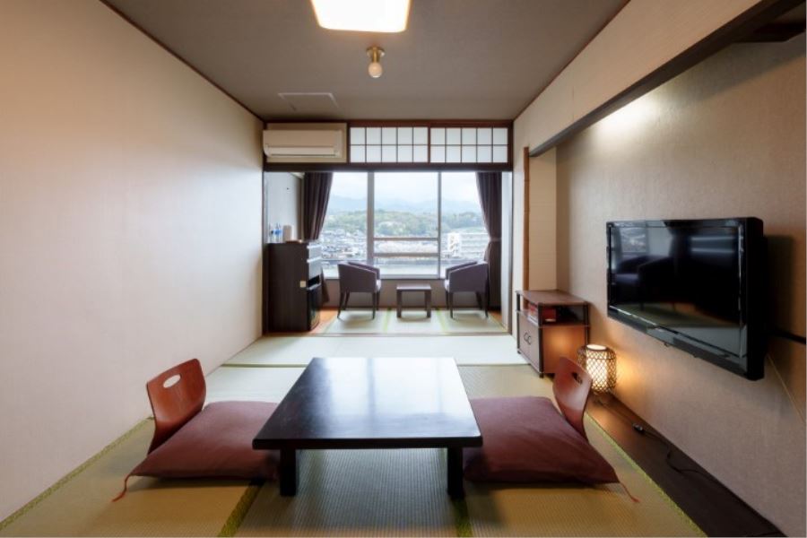フロントのある1階はリフォームされてて綺麗です。 客室は8帖の和室でしたが、年季は入っているものの、清掃はしっかりされていて快適です。 昼間は各階のエレベーターホールはちょっと暑かったけど、夕方からはエアコン入れたのかな?涼しくなりました。 温泉は、チェックイン直ぐに入ったときは熱めでしたが、直ぐに慣れ、柔らかい感じの泉質でした。 夜に入った時は温めになってて、露天風呂は高層階なので風が冷たく、お湯が温いと若干物足りないかな。 眺めは最高で、目の前に屋形船が出てて、鵜飼?をしてましたね。 お安いけど満足度の高いホテルです。 ちなみに、川の目の前ですが、杖立や黒川の様に川音がうるさい事もなく、静かで快適です。