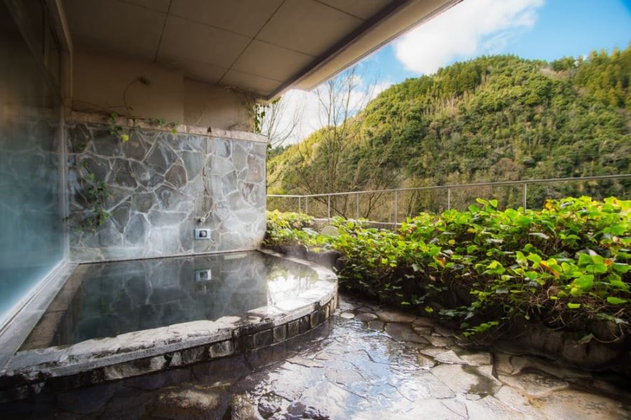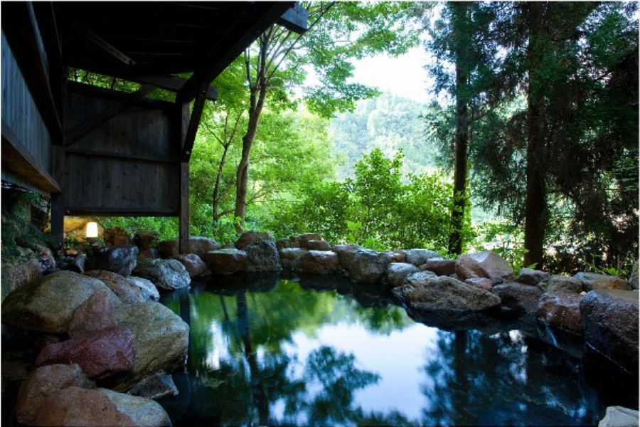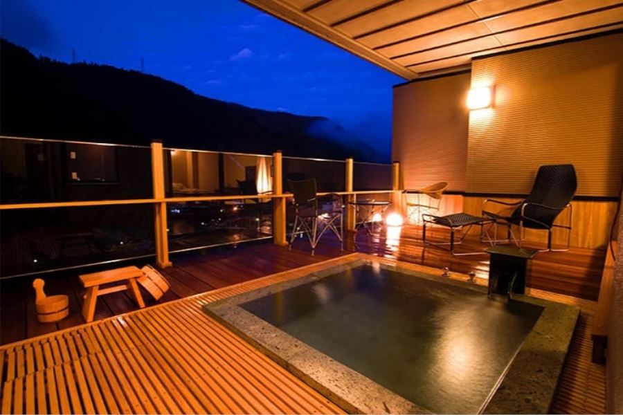 ❤部屋付きの広いデッキ露天風呂がいい。 ◆施設 フロントは3階、エレベーターは2階から上階の間、1階には階段。部屋付き露天風呂は広いデッキにあり、ロケーションもよく、紫陽花や川の流れや列車の音で寛げる。ただ、トイレ付きユニットバスは悲しい。大浴場は内風呂+露天風呂、外階段を下れば野趣溢れる岩露天風呂 ◆食事 夕食は先にある程度配膳、後からも出てくるから量は多く、お酒が入れば食べ切れない位かも。朝食も量は十分。 ◆サービス 部屋着が浴衣と作務衣の2種類あるのは嬉しい。