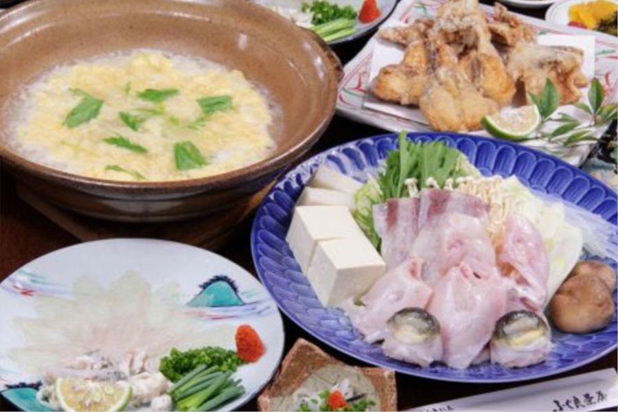 比較的安価にフグが食べれます。養殖フグで年中食べれるようです。女性だとフグ刺しで満足するほどの量でした。フグ鍋、皮のポン酢あえ、フグ雑炊、唐揚げで1万円人いきませんでした。少し古いですが見栄え気にしなければオススメです。