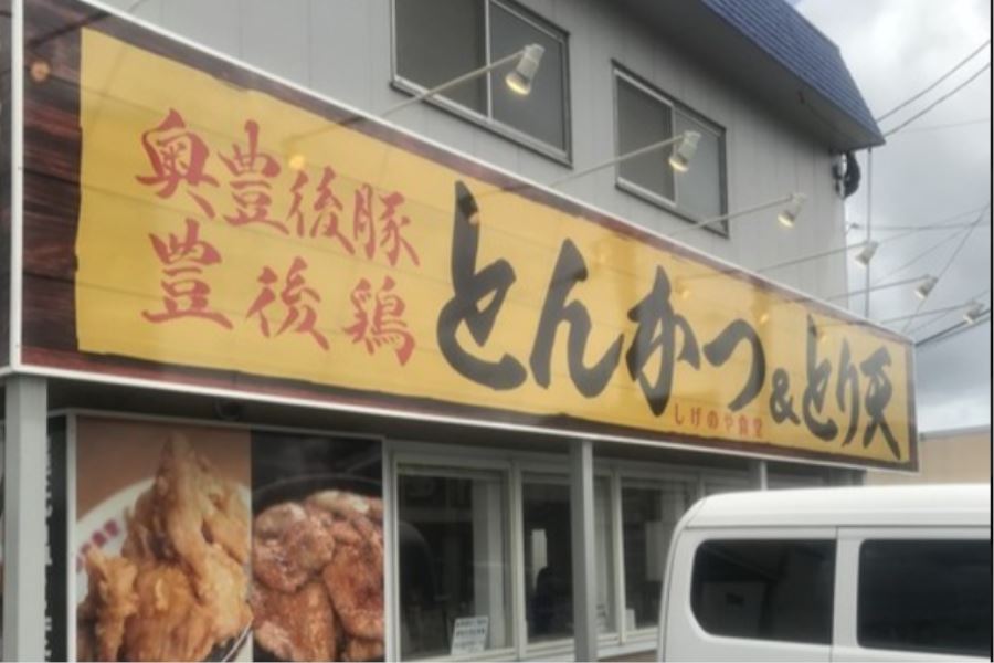 国道442号線沿いにあるしげのや食堂。2022年の『食べに行き大賞』のグランプリを取得して知名度が更に上がった。最近ではYouTubeやInstagramでもよく紹介されている。駐車場は店の前から国道沿いにあるが店舗前の駐車スペースは狭く駐車し難い。昼時や夜は人が多い為、駐車できない場合がある。注文は食券を購入して席に持ってきてもらうシステム。お水はセルフ。水とレモン水がある。タレは各テーブルに自家製ダレ、岩塩、ワサビ、酢と複数用意してあり好みで選べる。どのメニューも揚げ物は衣はサクサクで肉の味はジューシーである。