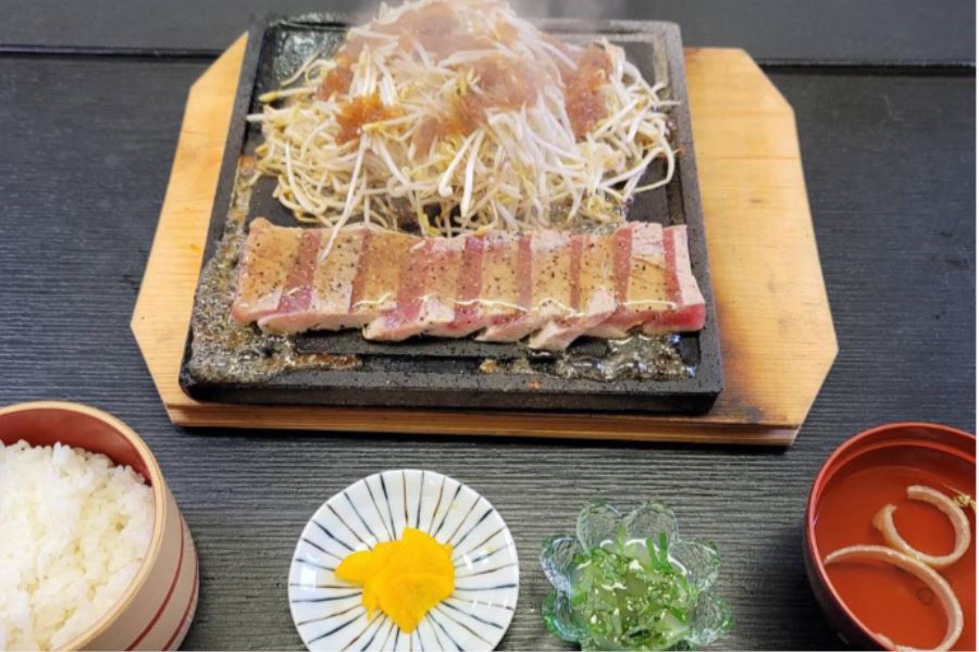 津久見に行ってもこんなお店があるとは気付かなかったけど、なかなか評価が高かったので行きました。日曜日の12時10分頃でしたが、店内めちゃくちゃ広くて、席も結構空いていて、すぐに座れました。自分が注文したのは、ステーキ醤油カボス定食(2,640円)。アツアツの鉄板に乗って来たまぐろのステーキ。大量のモヤシもあってすごいビジュアル。まぐろのステーキは、あっさりした味で、なかなか美味しい!ニンニクチップと甘辛いタレでいい感じ。モヤシは鉄板の上でアツアツですが、シャキシャキで旨い。りゅうきゅう丼(1,430円)も少し食べたけど、新鮮なマグロが旨い!ごちそうさまでした~!。