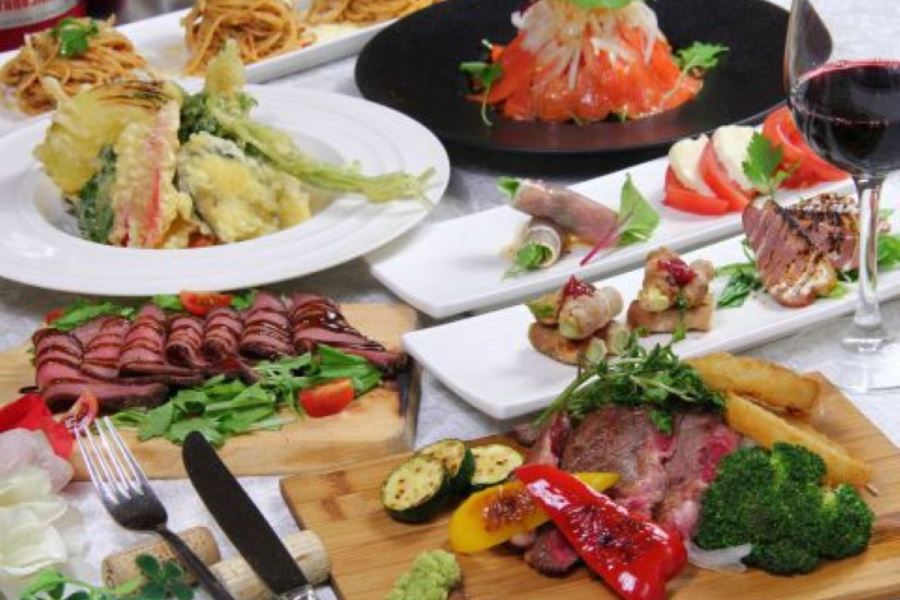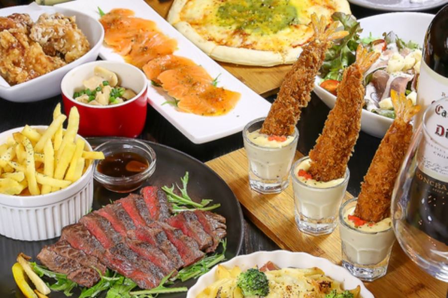 豊後牛のステーキや大分名物からあげを中心に充実したFOODメニューで、チーズや生ハムなどお酒にぴったりの料理や、ピザ、パスタなどもご用意しています!女性にも大人気のスイーツも充実。また、人気の半個室では異なるテーマの4部屋をご用意しています。20名から80名までの貸切も可能で、プロジェクターや音響設備も完備しています。貸切や二次会にぴったり!少人数の貸切もお気軽にご相談ください。